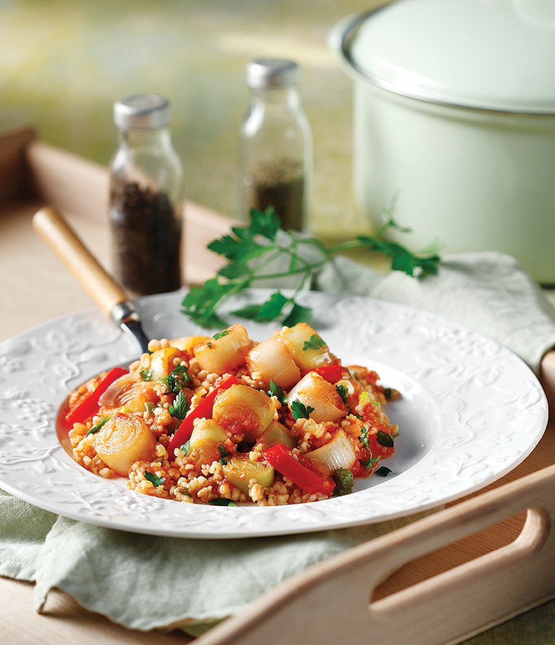 Πλιγούρι με πράσα και κόκκινες πιπεριές