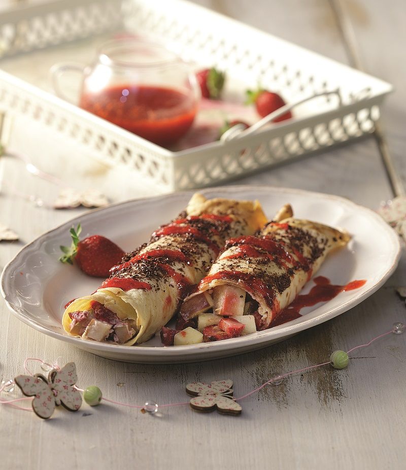 Ποιος μπορεί να πει όχι σε γλυκές κρέπες; Στην ανοιξιάτικη εκδοχή τους, τις γεμίζουμε με φρούτα και γάλα, τις πασπαλίζουμε με τριμμένη κουβερτούρα και τις σερβίρουμε με φραουλένια σάλτσα.