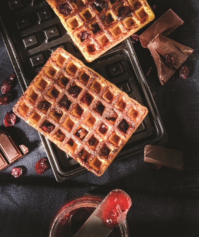 Οι βάφλες αλλιώς. Πιο τραγανές και θρεπτικές, θυμίζουν πιο πολύ μπάρες, αφού περιέχουν μεταξύ άλλων αλεύρι κινόα, ρυζάλευρο, μαύρη σοκολάτα και κράνμπερι. Μπορείτε να τις περιχύσετε με το σοκολατένιο άλειμμα με φουντούκι που ακολουθεί.