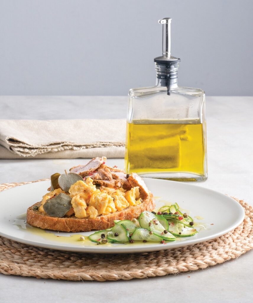 Aυγά scrambled σε προζυμένιο ψωμί με απάκι, έτοιμα στο πι και φι