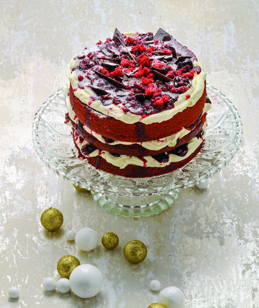 Κέικ βανίλια: Προθερμαίνουμε τον φούρνο στους 180°C. Χτυπάμε στο μίξερ το βούτυρο με τη ζάχαρη σε δυνατή ταχύτητα μέχρι να γίνει λείο το μείγμα. Προσθέτουμε ένα-ένα τα αυγά, το γάλα και το κόκκινο χρώμα. Κοσκινίζουμε όλα τα στεγνά υλικά και τα ενσωματώνουμε στο μείγμα. Μοιράζουμε σε 2 φόρμες και ψήνουμε για 30΄. Κρυώνουμε.