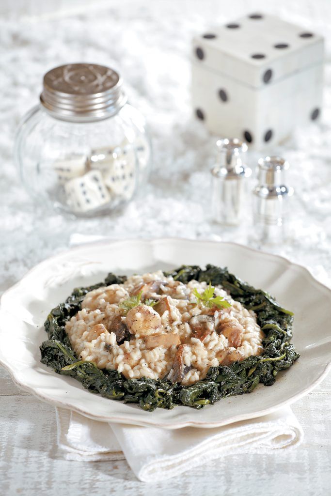 Ριζότο με κάστανα και μανιτάρια σε στρώση από σοταρισμένο σπανάκι