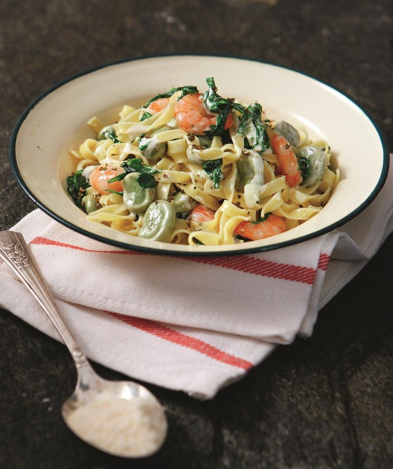 Ταλιατέλες με γαρίδες, κουκιά και ρόκα