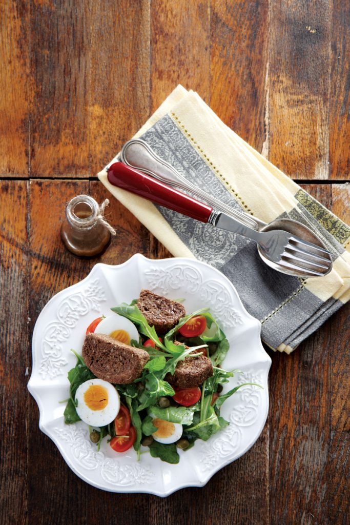 Σαλάτα ρόκα με παξιμάδια χαρουπιού, δυόσμο και βραστά αβγά
