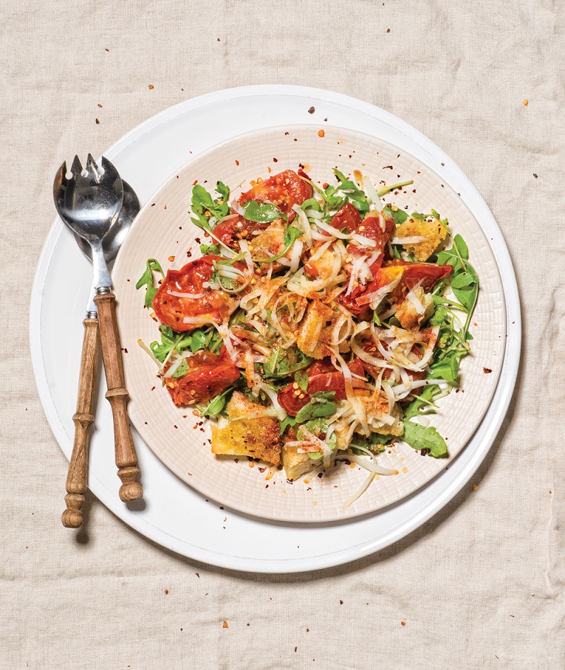 Σκορδόψωµο µε φουρνιστές ντοµάτες, πικάντικη ρόκα και Μετσοβόνε
