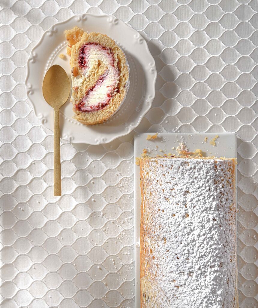 Αφήνουμε να κρυώσει και ξεφορμάρουμε. Αλείφουμε τη βάση αυτή με τη μαρμελάδα, απλώνουμε από πάνω την κρέμα και τυλίγουμε σε σφιχτό ρολό με τη βοήθεια αντικολλητικού χαρτιού.