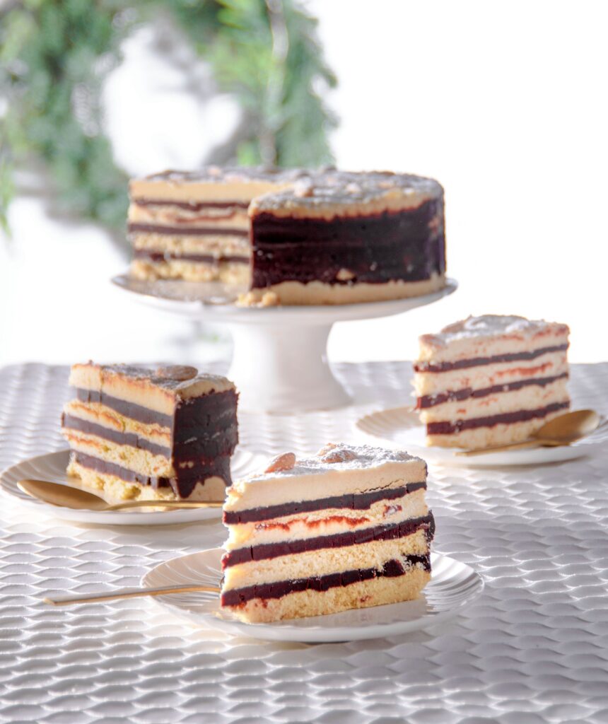Για τη συναρμολόγηση: Τοποθετούμε σε πιατέλα τον έναν δίσκο. Με τη βοήθεια μιας παλέτας ή με σακούλα ζαχαροπλαστικής απλώνουμε το 1/3 της γκανάς πάνω από τον δίσκο, καλύπτουμε με τον δεύτερο δίσκο και συνεχίζουμε την ίδια διαδικασία τελειώνοντας με τον δίσκο μπισκότου στον οποίο έχουμε τοποθετήσει τα αμύγδαλα. Αφήνουμε να σταθεί και πασπαλίζουμε με άχνη.