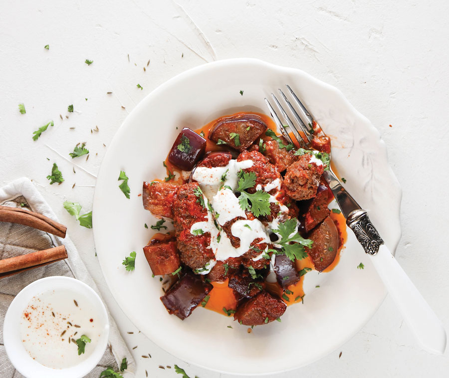 Η γλύκα της μελιτζάνας συναντά τα μπαχαρένια σουτζουκάκια και το δροσιστικό γιαούρτι σε ένα ιδιαίτερα απολαυστικό πιάτο!