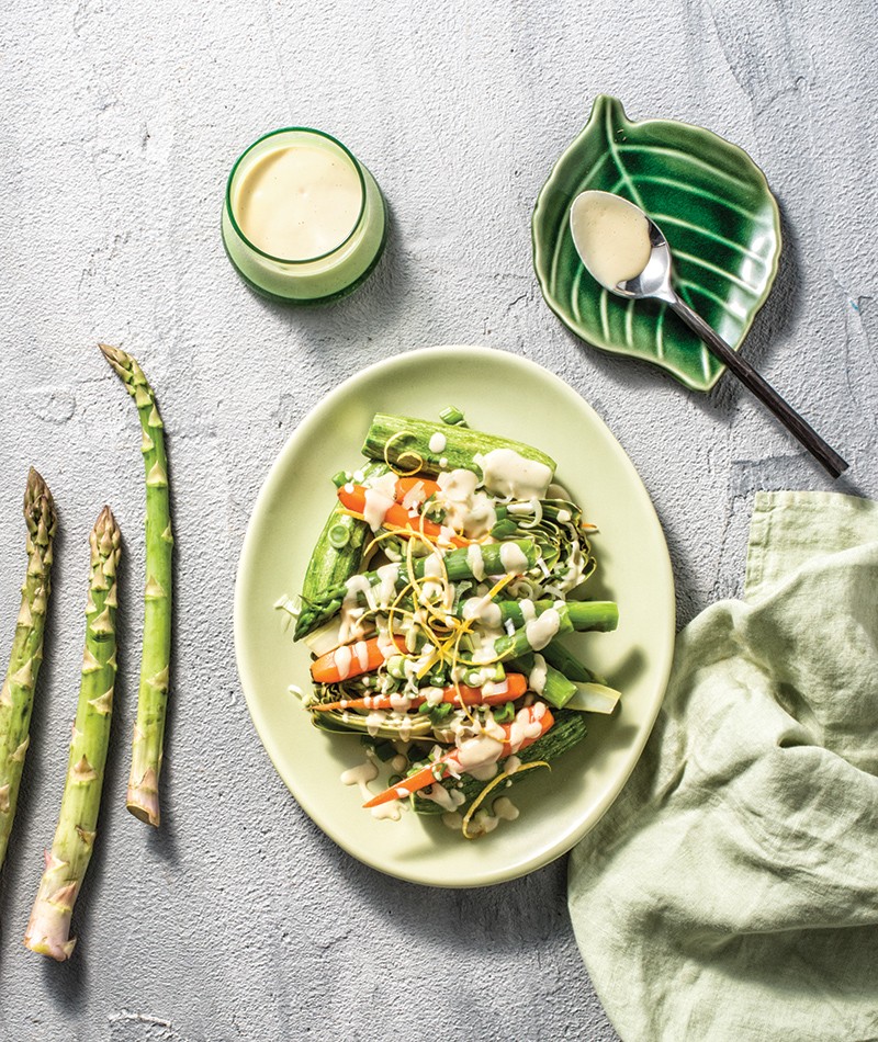 Ανοιξιάτικα αχνιστά λαχανικά με σάλτσα μουστάρδα – ταχίνι