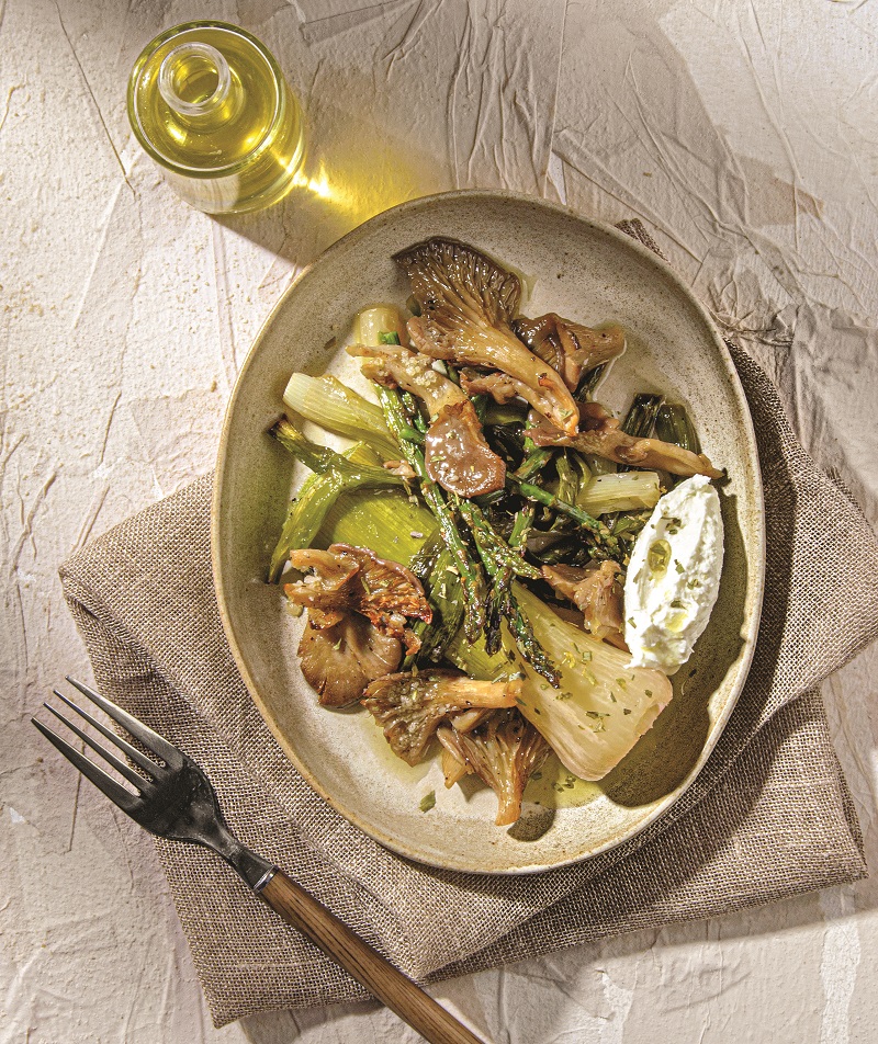 Ζεστή σαλάτα με τρυφερά πράσα, κρεμμυδάκια, σπαράγγια και μανιτάρια