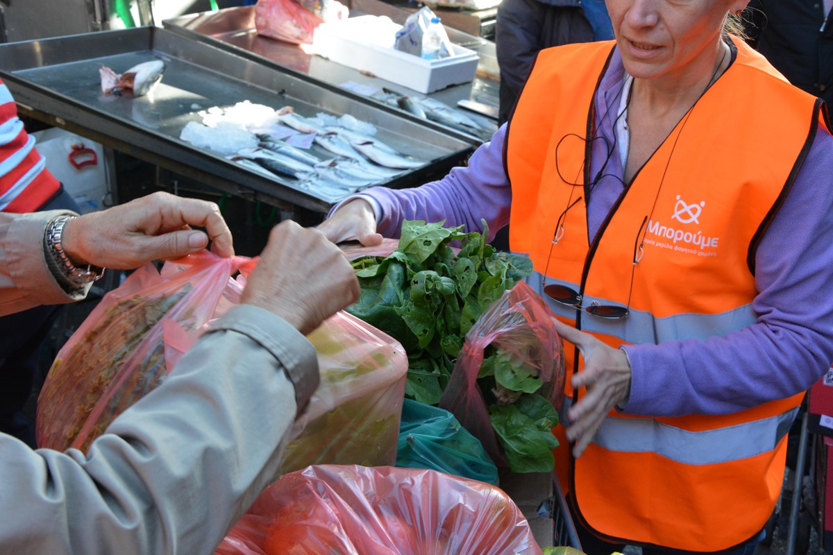 Μέλη της ομάδας του οργανισμού «ΜΠΟΡΟΥΜΕ» σε λαϊκή αγορά συγκεντρώνοντας τρόφιμα
