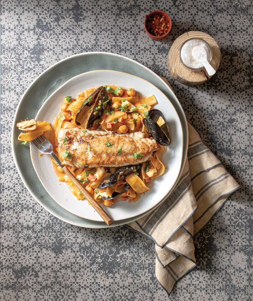 Θασιώτικοι γιουφκάδες με ρεβίθια, φιλέτο χριστόψαρου, μύδια, σύγλινο Μάνης και σφέλα