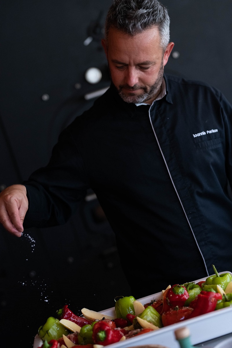Ο Γιάννης Παρίκος ετοιμάζει κλασικά γεμιστά στο Sea Rocks της Πάρου. Στο νέο all day beach bar στον Αμπελά, οι ελληνικές συνταγές δίνονται με μοντέρνες πινελιές από τον βραβευμένο σεφ. Σε αυτή την κλασική συνταγή για γεμιστά συμπρωταγωνιστικό ρόλο παίζουν οι σταφίδες και το κουκουνάρι.