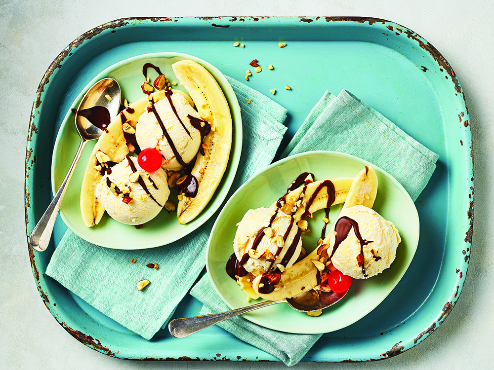 Κόβουμε τις μπανάνες στη μέση κατά μήκος και τις βάζουμε σε μπολ. Βάζουμε 2 μεγάλες μπάλες παγωτό βανίλια σε καθεμία και από πάνω μια χούφτα ψιλοκομμένα φουντούκια, σιρόπι σοκολάτας και γαρνίρουμε με λίγα κεράσια μαρασκίνο από πάνω.