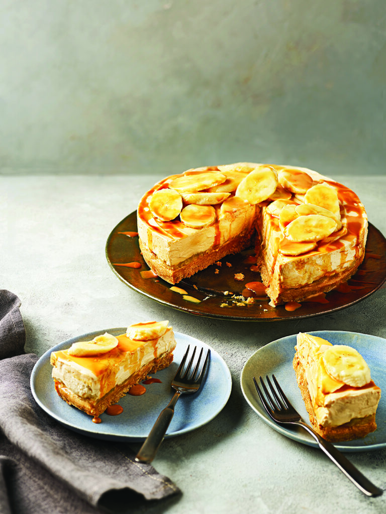Αφαιρούμε προσεκτικά από τη φόρμα μας και τοποθετούμε το banoffee μας σε μια πιατέλα σερβιρίσματος. Κόβουμε τις μπανάνες σε ροδέλες, τις βάζουμε σε ένα μπολ και ρίχνουμε το λεμόνι να πάει παντού. Τις τοποθετούμε έπειτα σε όλη την επιφάνεια πάνω από την καραμέλα μας. Χτυπάμε σε ένα μπολ την κρέμα γάλακτος μέχρι να γίνει σαντιγί και απλώνουμε τη σαντιγί πάνω από τις μπανάνες. Γαρνίρουμε με σιρόπι καραμέλας και σερβίρουμε αμέσως ή βάζουμε στο ψυγείο μέχρι το σερβίρισμα.