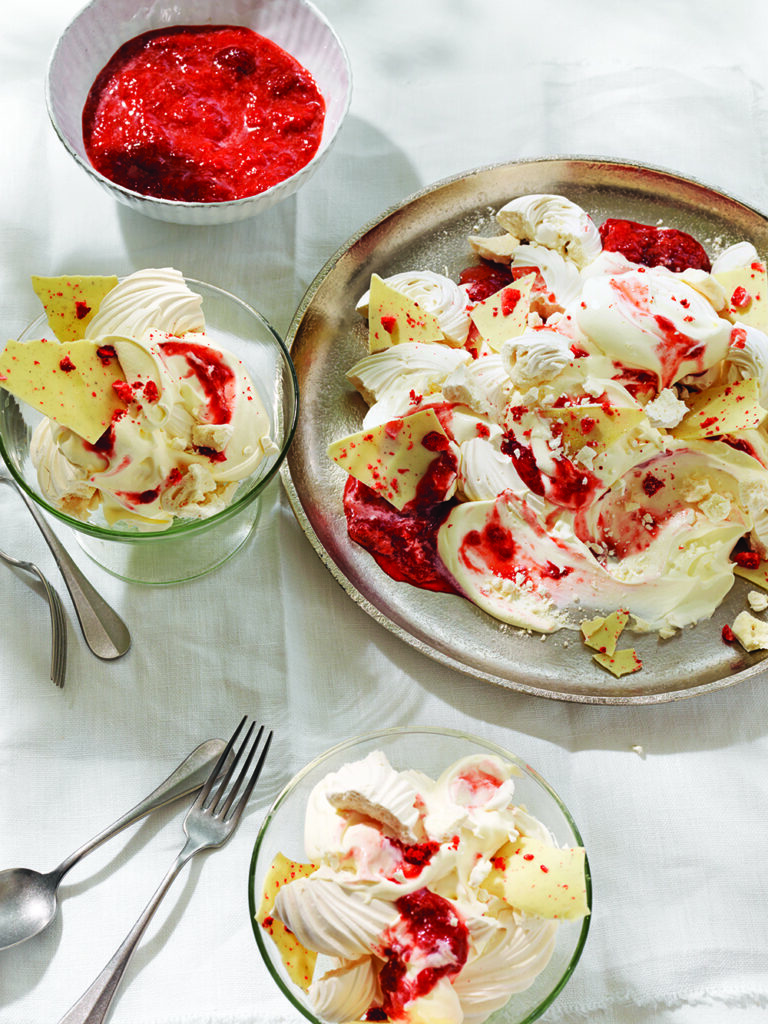 Στη συνέχεια σπάμε απαλά μερικές από τις μαρέγκες σε μεγάλα κομμάτια και βάζουμε μερικές από αυτές σε μια μεγάλη πιατέλα σερβιρίσματος.Περιχύνουμε με ένα κουτάλι λίγη από την κρέμα και λίγο από τη μαρμελάδα φράουλας και μετά επαναλαμβάνουμε, σχηματίζοντας τις στρώσεις.Γαρνίρουμε με λίγες φρέσκες φράουλες, σερβίρουμε και απολαμβάνουμε.