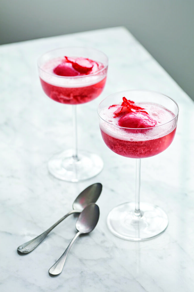 Λίγο προτού σερβίρουμε το κύριο πιάτο μας, βάζουμε μια μπάλα σορμπέ σε κάθε ποτήρι σαμπάνιας και μετά βάζουμε τα ποτήρια στην κατάψυξη. Όταν είναι έτοιμο για σερβίρισμα, περιχύνουμε προσεκτικά το σορμπέ με λίγο αφρώδες ροζέ κρασί. Από πάνω γαρνίρουμε τις φέτες φράουλας, σερβίρουμε και απολαμβάνουμε.