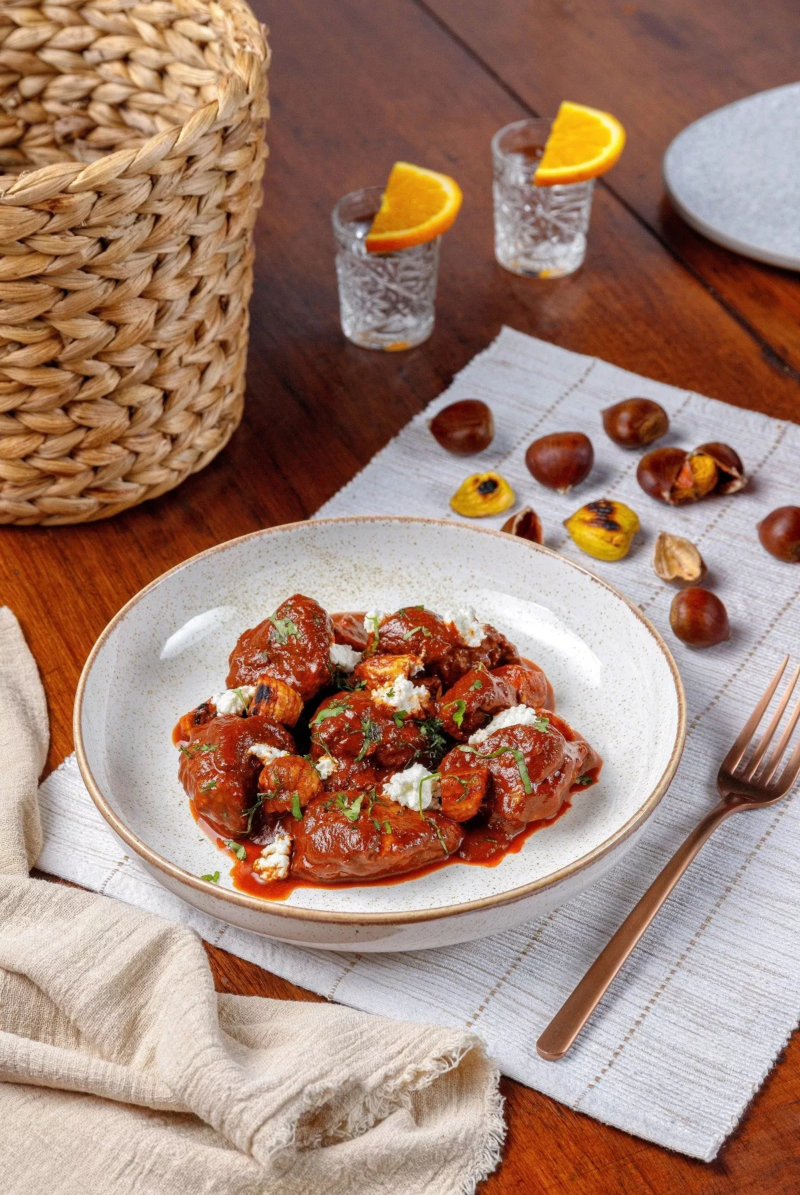 Πικάντικο μοσχαράκι με κάστανα και γαλομυζήθρα