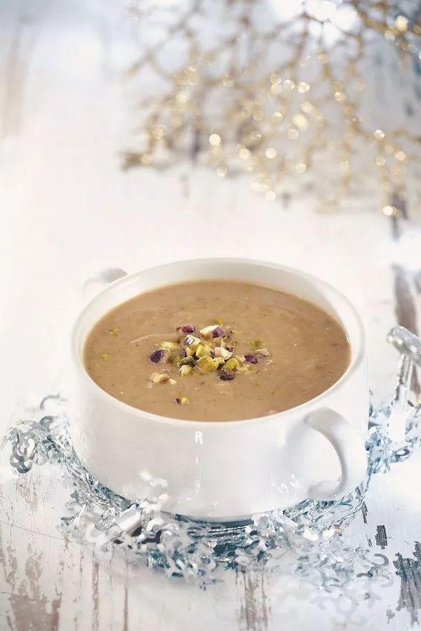 Κολοκύθα και κάστανα σε μια φθινοπωρινή σούπα με τα όλα της! Το σύγκλινο και τα φιστίκια συμπληρώνουν την πλούσια γεύση της.