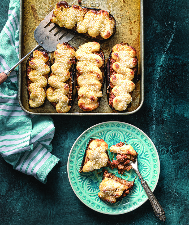 Τοποθετούμε τις μελιτζάνες σε ένα πιρέξ και τις πιέζουμε με τη βοήθεια ενός πιρουνιού μέχρι η ψίχα να κάνει λακκούβα. Γεμίζουμε τις μελιτζάνες με τον κιμά και με τη βοήθεια μιας σακούλας ζαχαροπλαστικής σχηματίζουμε μια κυματιστή στρώση πουρέ. Αν θέλουμε, μπορούμε να βάλουμε τον πουρέ σε ένα κορνέ ζαχαροπλαστικής με μύτη αστεριού για να δώσουμε σχήμα. Τέλος, πασπαλίζουμε με την τριμμένη παρμεζάνα και ψήνουμε σε προθερμασμένο φούρνο στους 180οC για 45΄.