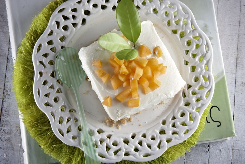 Ένα πολύ ωραίο και δροσερό επιδόρπιο, με σπιτικό τριμμένο μπισκότο ολικής και κρέμα, γαρνιρισμένο με φρούτα της επιλογής μας. Εμείς επιλέξαμε ροδάκινα.