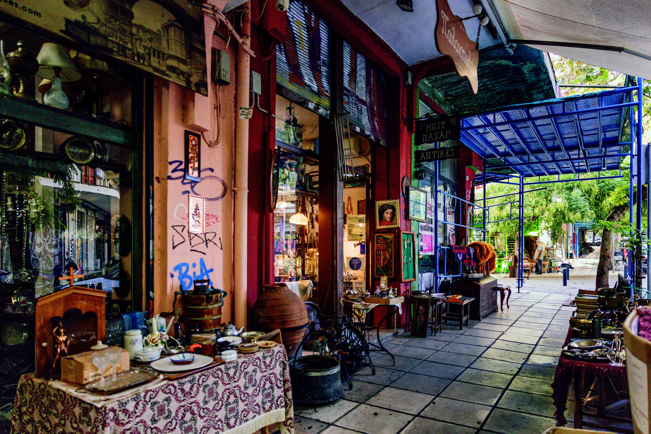 Τι το ενδιαφέρον έχει σε μια γαστρονομική περιπλάνηση στην πόλη; Είναι σαν να ρωτάμε γιατί να πάει ένας ταξιδιώτης στο Μοναστηράκι. Στους δρόμους γύρω από την περίκλειστη αγορά αναπτύσσονται αμέτρητα μικρότερα και μεγαλύτερα παλαιοπωλεία, στα οποία μπορείτε να βρείτε οτιδήποτε – κυριολεκτικά. Από παλιά Κλασσικά Εικονογραφημένα, βινύλια, έπιπλα και μεσοπολεμικά φωτιστικά μέχρι κινέζικα διακοσμητικά και ψεύτικα κινητά. Οι φυσιογνωμίες των ιδιοκτητών και των υπαλλήλων θυμίζουν πίνακες ζωγραφικής και τα παζάρια μαζί τους είναι απολαυστικά. Ανάμεσα στα νόμιμα, χαριτωμένα τα περισσότερα, μαγαζιά παρεισφρέουν και μικροπαραβατικοί που επιχειρούν να πουλήσουν ό,τι δεν βάζει ο νους σας. Όλα τούτα κλείνουν με τη δύση του ήλιου.