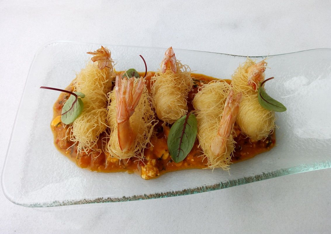 Γαρίδες κανταΐφι με σάλτσα σαγανάκι