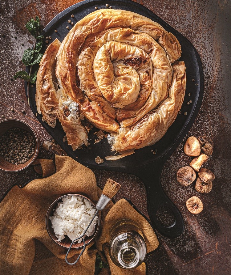 Στριφτή τυρόπιτα με αποξηραμένα σύκα και πράσινο πιπέρι