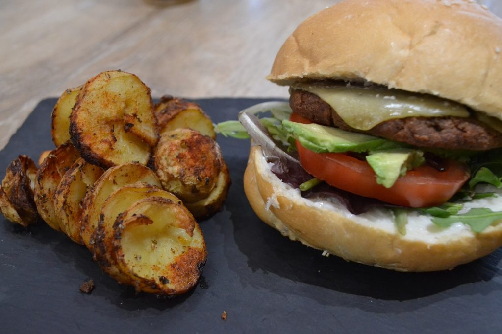 Vegan burger χωρίς γλουτένη με στριφογυριστές πατάτες φούρνου