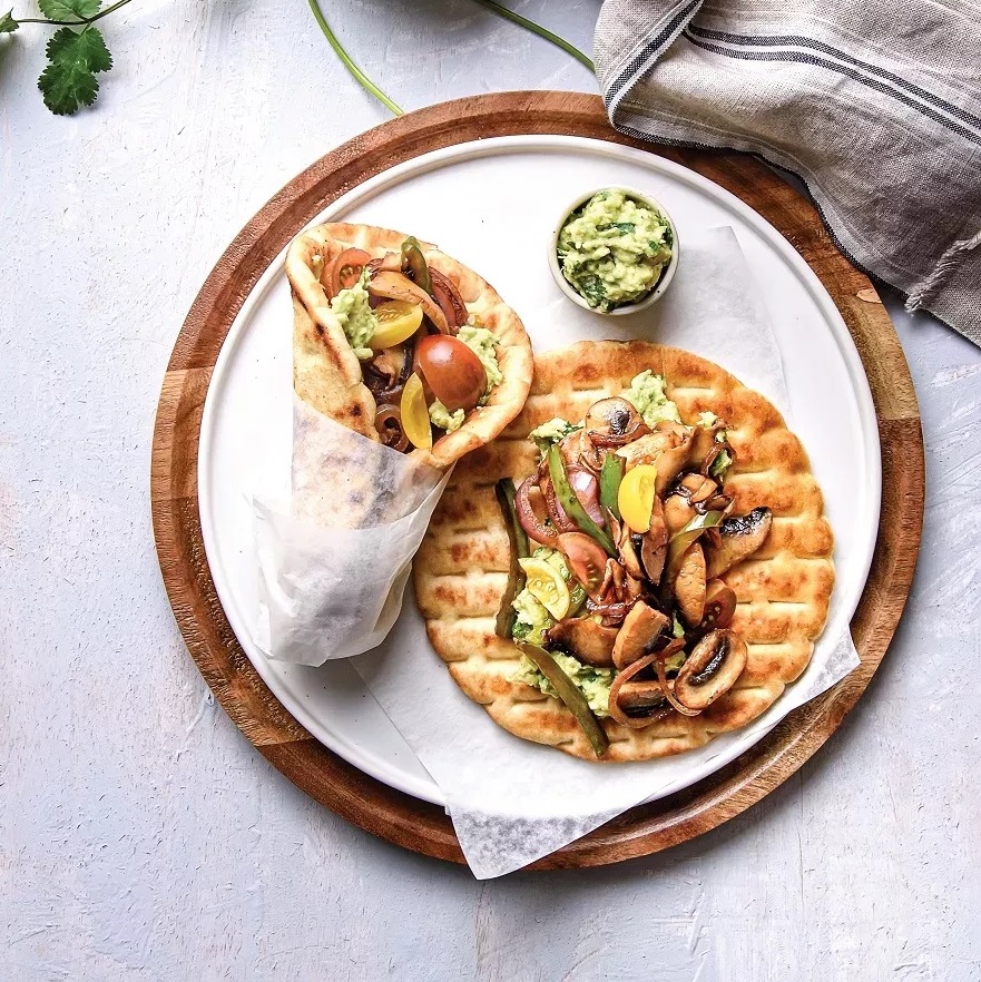 Αντί για γύρο, χρησιμοποιούμε μανιτάρια και χρωματιστές πιπεριές ενώ για σος έχουμε ένα γουακαμόλε. Και υγιεινό και νηστίσιμο και vegan.