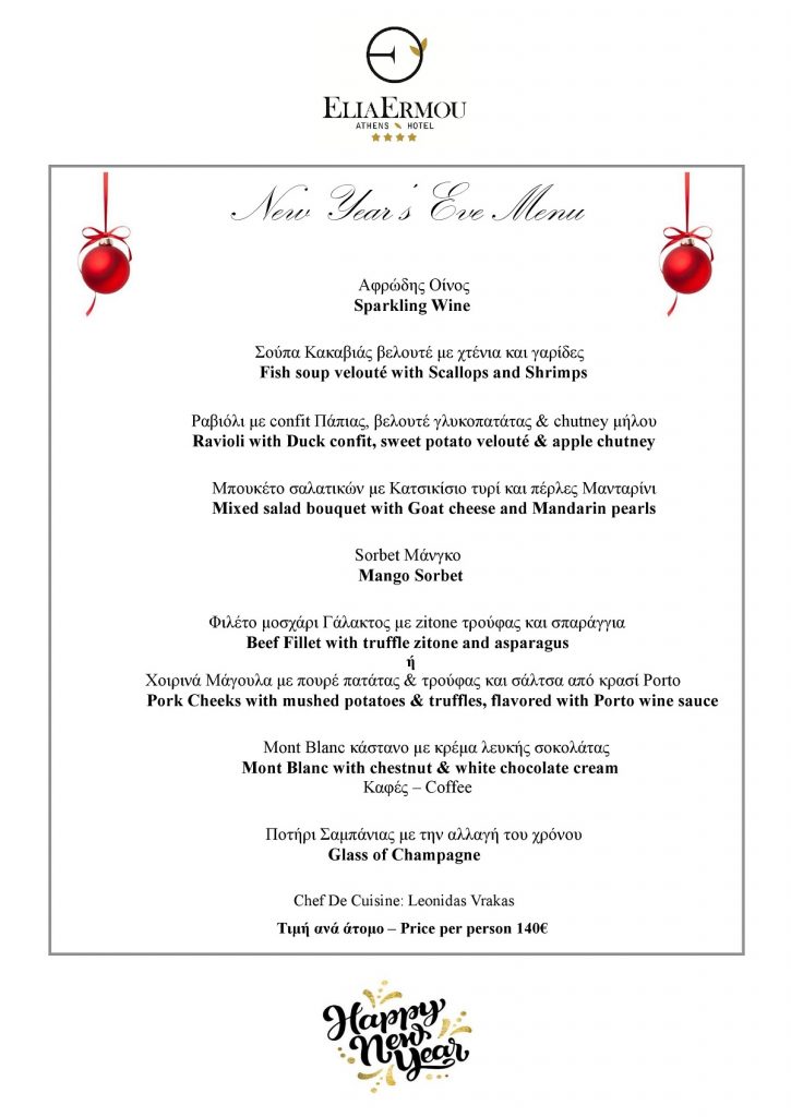 Ιδανική ευκαιρία για να επισκεφθείτε το Athens View Balcon είναι και η τελευταία και πιο λαμπερή νύχτα της χρονιάς. Ζήστε την αλλαγή του χρόνου, με θέα την κατάφωτη Αθήνα και τα βεγγαλικά στον νυχτερινό ουρανό της πρωτεύουσας, που θα πλαισιώνουν την Ακρόπολη. Το μενού της βραδιάς, πιο εορταστικό, κρατά τον μεσογειακό του χαρακτήρα, αλλά προσαρμόζεται στην περίσταση.