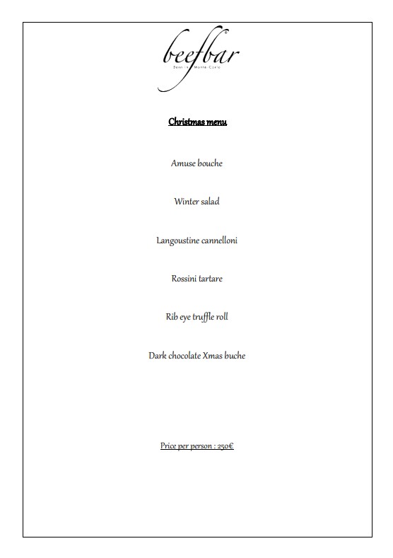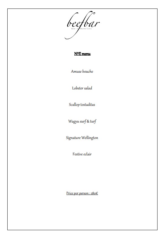 Στο μενού της Παραμονής Χριστουγέννων οι μεγάλοι πρωταγωνιστές είναι το rossini tartare, το langoustine cannelloni και το εντυπωσιακό rib eye truffle roll. Όσοι επιλέξουν το Beefbar Athens για το δείπνο της Παραμονής Πρωτοχρονιάς θα έχουν την ευκαιρία να απολαύσουν μεταξύ άλλων ιδιαίτερες προτάσεις όπως τα scallop tostaditas, το wagyu surf & turf και το signature wellington.
