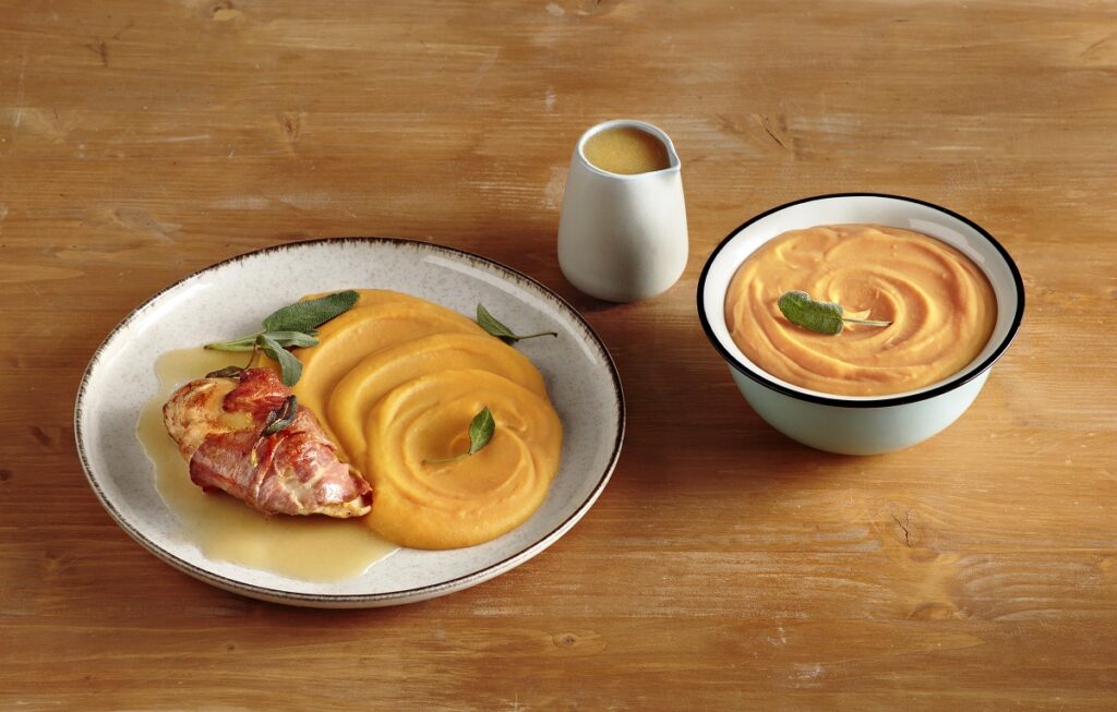 Μπορείτε να φτιάξετε το πιο γρήγορο και νόστιμο συνοδευτικό για το γιορτινό τραπέζι χρησιμοποιώντας τον Πουρέ Πατάτας με Γλυκοπατάτα και Καρότο ΓΙΩΤΗΣ, που θα συνοδεύσει τέλεια το Κοτόπουλο με προσούτο και φασκόμηλο.
