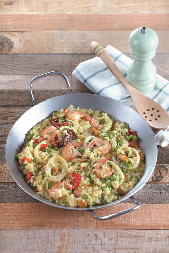 Το εθνικό πιάτο των Ισπανών σε μια αιγαιοπελαγίτικη εκδοχή, αποκλειστικά με θαλασσινά και λαχανικά. Αντί για κάτι κρεατικό, χρησιμοποιούμε γαρίδες, χταπόδι και σουπιές. Το πιάτο απογειώνεται με Αρακά Naturel, Καλαμπόκι Naturel και Αποφλοιωμένα Ντοματάκια ΟΜΟΣΠΟΝΔΙΑ.