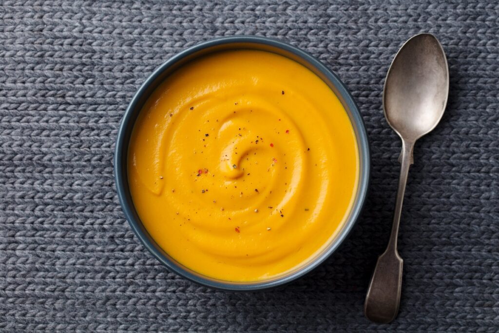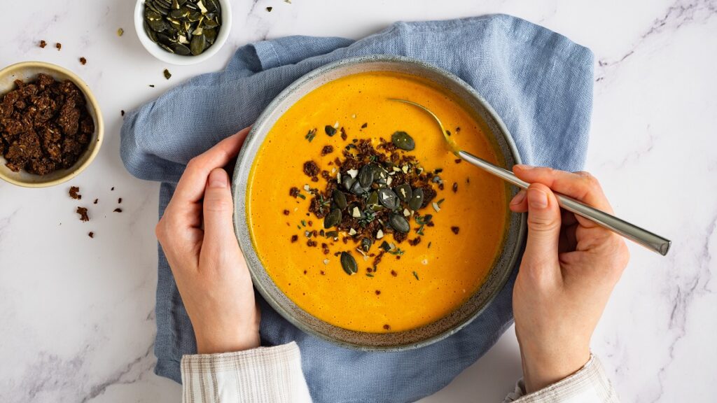 Η κολοκυθόσουπα είναι η ενδεχομένως η πιο αγαπητή βελουτέ σούπας. Αυτό το λαχανικό με το χαρακτηριστικό πορτοκαλί χρώμα όταν συνδυαστεί με τα κατάλληλα υλικά μάς δίνει την πιο νόστιμη και βελούδινη σούπα. Τι θα χρειαστείτε; 400γρ. κολοκύθα, 300γρ. ντοματίνια, θυμάρι, μια σκελίδα σκόρδο, 400 ml γάλα καρύδας και λίγο ελαιόλαδο. Η διαδικασία απλή. Το μόνο που χρειάζεται είναι να ψήσετε τα λαχανικά σε προθερμασμένο φούρνο. Στη συνέχεια -κι αφού τα έχετε αφήσει να κρυώσουν για περίπου 15’- αφήνεστε στα χέρια του Multiquick της Braun. Χάρη στη Splash Control Technology, έχετε το τέλειο αποτέλεσμα πολτοποίησης χωρίς πιτσιλίσματα. Παράλληλα, έχει πολύ δυνατά εξαρτήματα που τεμαχίζουν ακόμα και ολόκληρα τρόφιμα σε μερικά δευτερόλεπτα. Για αυτήν τη συνταγή ρίχνετε όλο το περιεχόμενο του ταψιού σας μέσα στον κάδο/μπλέντερ 1,25L του ΜultiQuick 9, προσθέτετε και το γάλα καρύδας και αλατοπίπερο και σε λίγα δευτερόλεπτα έχετε την τέλεια κολοκυθόσουπα!