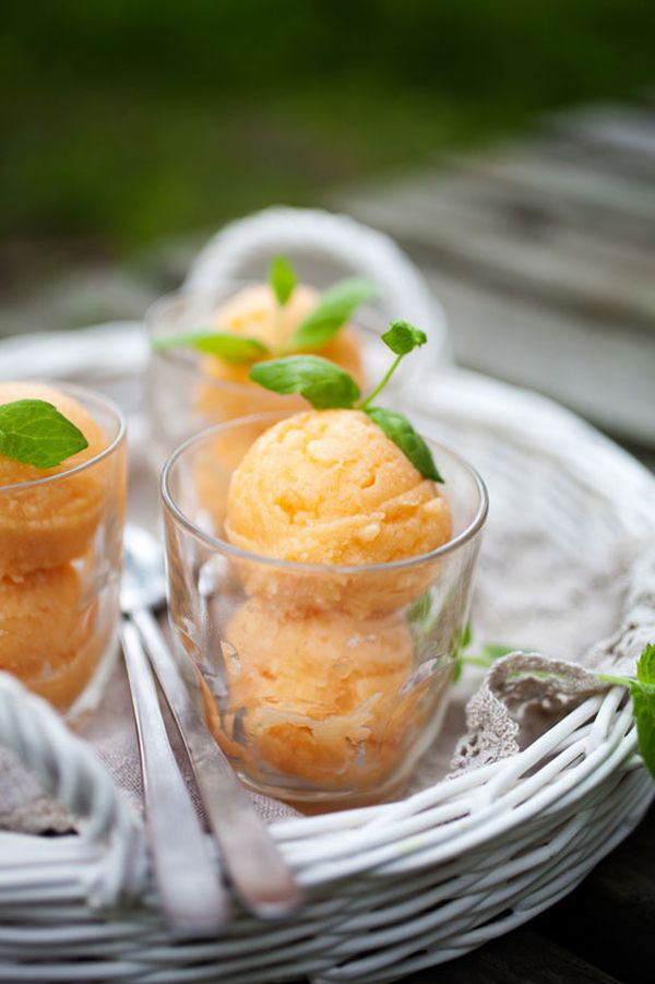 Βάζουμε σε ένα κατσαρολάκι το Φυσικό Μεταλλικό Νερό AQUA Carpatica με το μέλι και τα βράζουμε για 5 λεπτά (από τη στιγμή που θα αρχίσει ο βρασμός). Αποσύρουμε από τη φωτιά, προσθέτουμε το λικέρ και αφήνουμε το σιρόπι να κρυώσει. Καθαρίζουμε τα ροδάκινα και τα κόβουμε σε μικρά κομμάτια. Βάζουμε σε ένα μεγάλο μπλέντερ, τα ροδάκινα, το κρύο σιρόπι, το χυμό λεμονιού και το λικέρ. Πολτοποιούμε καλά μέχρι να δημιουργηθεί ένας απαλός πουρές. Μεταφέρουμε τον πουρέ σε μεταλλικό δοχείο και παγώνουμε στην κατάψυξη για 2 ώρες. Βγάζουμε το σορμπέ από το ψυγείο, ανακατεύουμε με ένα πηρούνι και το ξαναβάζουμε στην κατάψυξη για άλλες 2 ώρες τουλάχιστον. Σερβίρουμε το σορμπέ σε μπάλες με λίγα φύλλα μέντας.