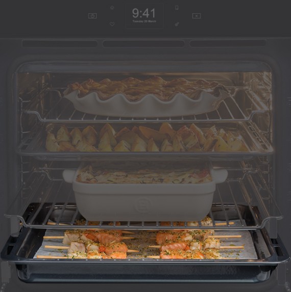 Προτεινόμενη συνταγή: 500γρ. τυρί γκούντα, 200γρ. τυρί έμενταλ, 200γρ. κασέρι γλυκό, 100γρ. Μετσοβόνε, 120γρ. βούτυρο, 3 αβγά 500ml γάλα φρέσκο, 170ml κρέμα γάλακτος, 10 φρέσκα μανιτάρια Champignon, 100gr. απάκι, 2 πρέζες καπνιστή πάπρικα. Εκτέλεση: αναμιγνύετε τα υλικά της συνταγής σας σε ένα μπολ, τα μοιράζετε σε ατομικά βουτυρωμένα ραμεκέν και ψήνετε σε προθερμασμένο φούρνο για 1 ώρα στους 160°C. Όταν τα βγάλετε από το φούρνο, χάρη στο soft closing της πόρτας, και τους τηλεσκοπικούς βραχίονες, βάζετε και βγάζετε το ταψί σας με ευκολία, και δεν αγχώνεστε για θορύβους.
