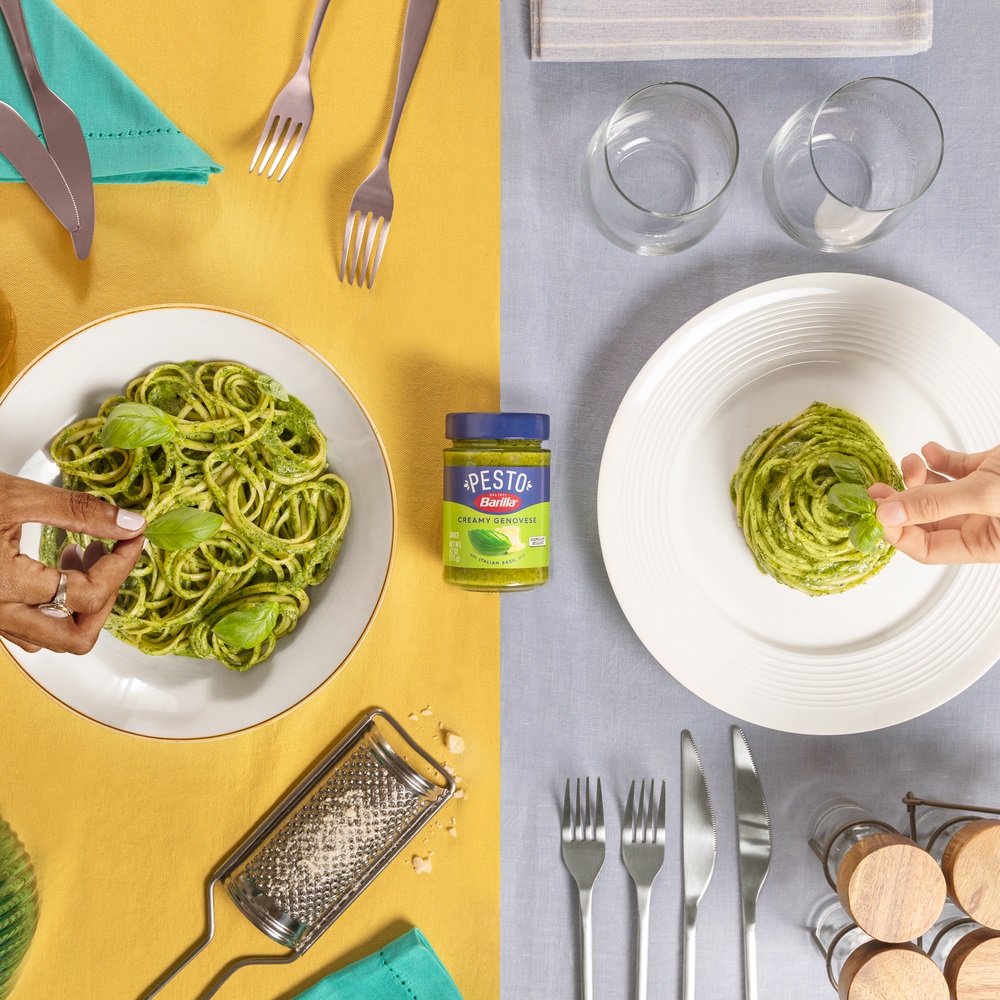 Δυο είναι τα συστατικά επιτυχίας της συγκεκριμένης pesto. Από τη μια έχουμε τον ολόφρεσκο βασιλικό, που προέρχεται από αγρότες, οι οποίοι σέβονται και ακολουθούν τους κανόνες της βιωσιμότητας και της αειφορίας. Μάλιστα, οι προμηθευτές βρίσκονται σε μικρή ακτίνα από τα εργοστάσιο της Barilla, ώστε να ελαχιστοποιηθεί ο χρόνος μεταξύ της συγκομιδής και της επεξεργασίας. Από την άλλη, η pesto alla genovese δεν γίνεται χωρίς το Parmigiano Reggiano Π.Ο.Π., που το αγοράζουν σε μεγάλα κεφάλια και το τρίβουν λίγο πριν το προσθέσουν στο μείγμα.