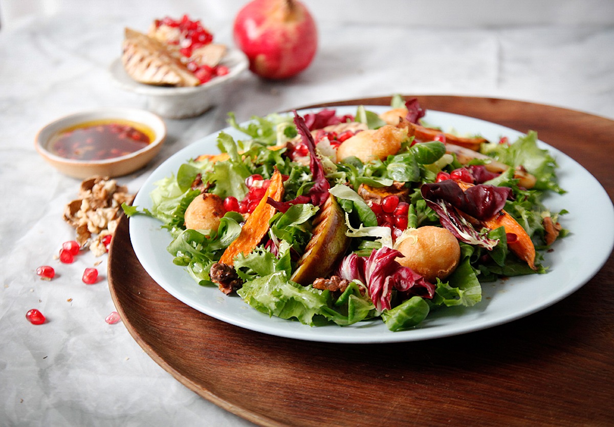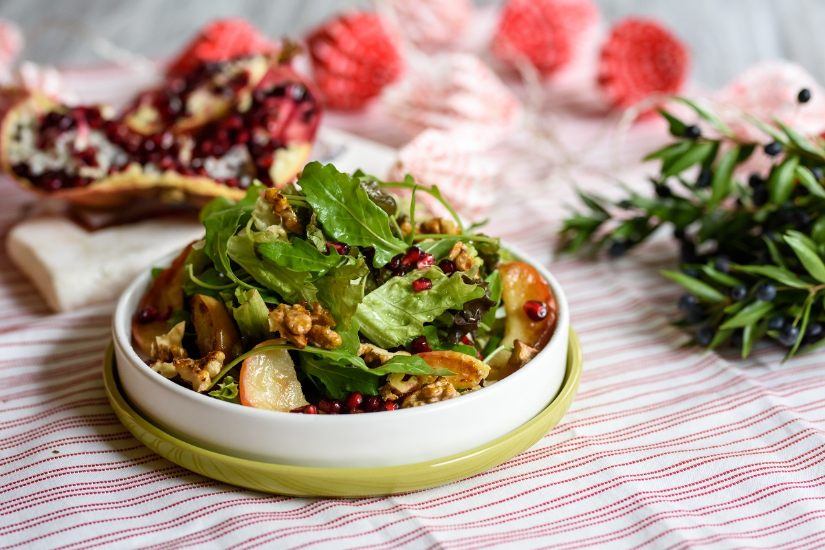 Χριστουγεννιάτικη σαλάτα με ψητό μήλο, ρόδι, μπλε τυρί και ντρέσινγκ κρέμα βαλσαμικού φράουλα