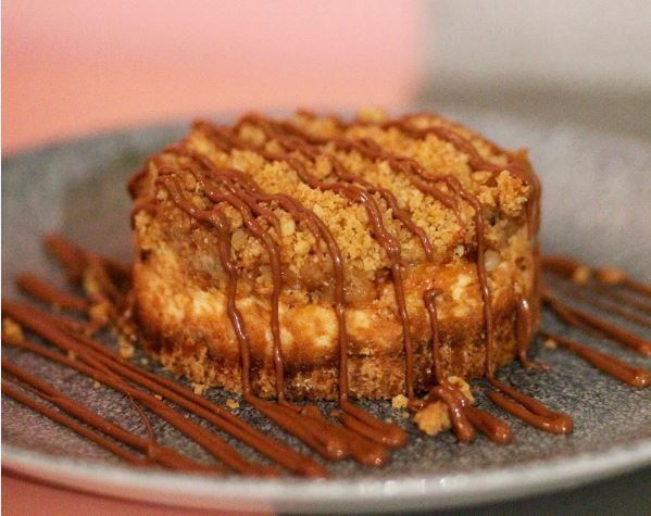 Στο τέλος, οπωσδήποτε apple crumble cheesecake, μια τέλεια βάση από ζύμη βουτύρου, κρέμα ψητού cheesecake και αρωματικό apple crumble. Εναλλακτικά, βέβαια, για τους chocoholics υπάρχει η Σούπα φουντουκιού με γάλα αμυγδάλου, καραμελωμένους ξηρούς καρπούς και παγωτό βανίλιας ή τα πιο κλασικά pancakes “λουσμένα” στη σοκολάτα. Να πάτε!