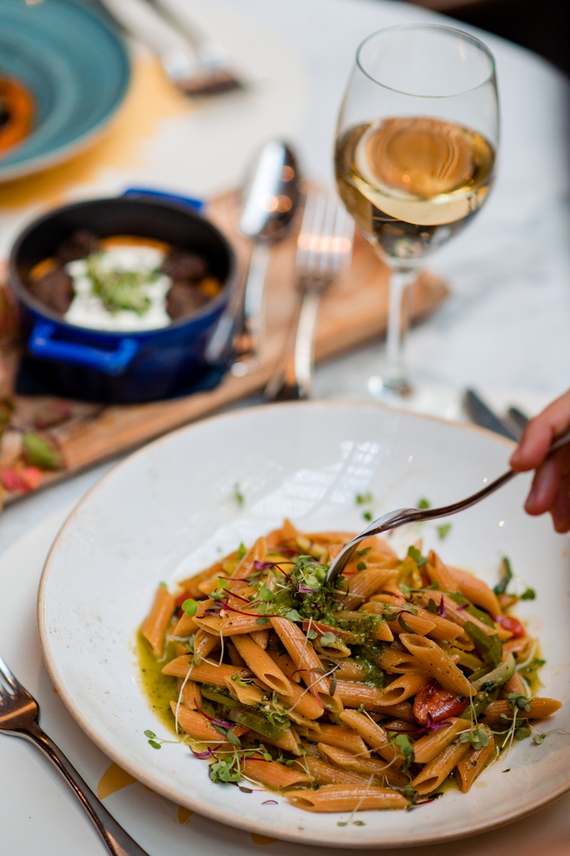 Πιο συγκεκριμένα, αναφορικά με τα όσα δοκιμάσαμε: τα «τραγανά φαλάφελ ρεβιθιού Λάρισας και παντζαριού με δυόσμο, γιαούρτι, ταχίνι, καπνιστή μελιτζανοσαλάτα και τσιπς από παντζάρι» έχει τίτλο σιδηρόδρομο, είναι πιάτο χωρίς κανένα απολύτως γευστικό νόημα, οι ρεβιθοκεφτέδες δεν ήταν τραγανοί και πρόκειται για πρόταση με απλή συνωνυμία με τα φαλάφελ τα οποία επίσης ουδεμία σχέση έχουν με την Ελλάδα γενικά. Ομοίως και τα «ψητά κεφτεδάκια ζυμωμένα με φυστίκι Αιγίνης, πετιμέζι, και σταφίδες πάνω σε πουρέ από γίγαντες, κρέμα φέτας και πούδρα από σουτζούκι που, αν και νόστιμα, δεν ήταν τα κεφτεδάκια της γιαγιάς, που πιθανόν να έτρωγαν το ΄60… Δεδομένου ότι έμοιαζαν φτιαγμένα με ένα μίγμα που θύμιζε περισσότερο κεμπάπ, θα μπορούσαν να είναι «κεμπάπ με πουρέ από γίγαντες» σε μια ωραία παρουσίαση στη λογική του μοιράσματος. Το τηγανόψωμο με τσιγαριαστά χόρτα ήταν καλοφτιαγμένο αλλά θα το δοκιμάζαμε σε ακόμα καλύτερη εκδοχή αν «έφευγε» άμεσα από το πάσο της κουζίνας για να φτάσει στο τραπέζι όσο ακόμα το τηγανόψωμο δεν είχε απορροφήσει το ζουμί από τα χόρτα ή εναλλακτικά, τα χόρτα να μην σερβίρονταν πάνω στο τηγανόψωμο. Από τα κυρίως, οι πέννες από αλεύρι φακής με μπρόκολο, ντοματίνια, πιπεριές κολοκυθάκι, παπαρουνόσπορο και pesto βασιλικού ήταν πιάτο χωρίς ένταση-κάτι που δεν περιμένεις από επιλογή που περιέχει pesto η οποία παρεμπιπτόντως, δεν έχει στοιχεία ελληνικά-, ενώ ο λεμονάτος μαύρος χοίρος, δεν έδινε την αίσθηση του «σιγομαγειρεμένου» αφού ήταν στεγνός και κρύος όπως και τα συνοδευτικά του. Συμπερασματικά, το Ilios είναι εστιατόριο που μπορεί να έχει κλείσει ένα χρόνο λειτουργίας αλλά στο κομμάτι της κουζίνας χρειάζεται ακόμα αρκετή δουλειά ώστε να αποκτήσει ξεκάθαρη γευστική ταυτότητα αλλά και να εξαλειφθούν οι τεχνικές αστοχίες.