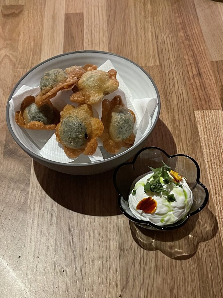 Ξεκίνησα το δείπνο μου με το ψωμί που φτιάχνουν από ένα προζύμι τεσσάρων ετών και συνοδεύουν με βούτυρο από ξινή κρέμα. Σχεδόν μαζί ήρθε και ο ταραμάς που μπορεί να είχε παραπανίσια κρεμώδη υφή, ήταν όμως ελαφρά όξινος, νόστιμος και με το φαγόπυρο από πάνω του αποκτούσε μια πιο τραγανή αίσθηση.
