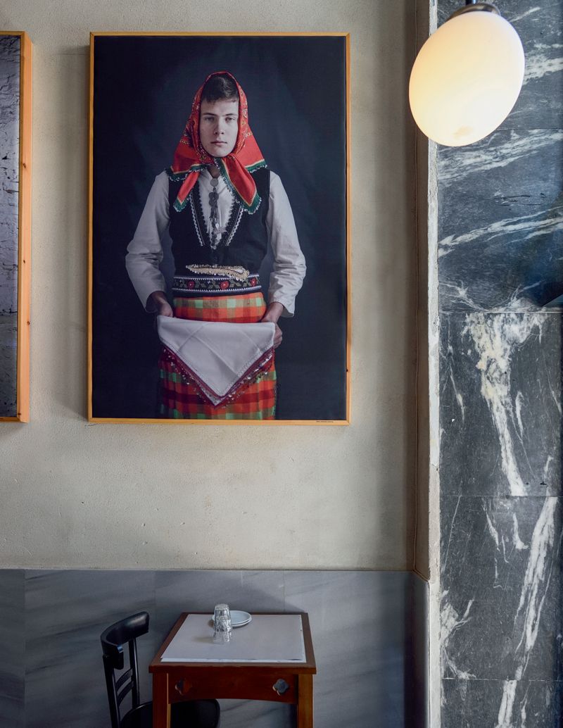 Στους τοίχους του εστιατορίου εκτίθενται έργα της συλλογής «Faces+Masks» του φωτογράφου Νίκου Βαβδινούδη