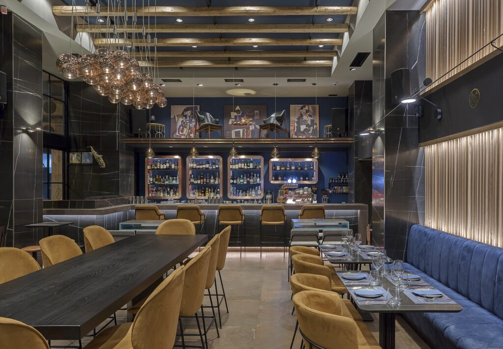 Επιβλητικό, κομψό, σε σκουρόχρωμο μοτίβο αυτό το all day μαγαζί εκπέμπει μια κομψότητα – η όμορφη μπάρα του στο βάθος σίγουρα θα τραβήξει την προσοχή σας μπαίνοντας. Περιτριγυρισμένο από τζαμαρίες που ανοίγουν και του δίνουν ακόμα μεγαλύτερη έκταση, διαθέτει και μια κρυφή εσωτερική σάλα για περισσότερη ιδιωτικότητα. Εδώ μπορείτε να απολαύσετε brunch με κάποιο ρόφημα καφέ τις πρωινές ώρες, προσεγμένα πιάτα το μεσημέρι ή το βραδύ (η κουζίνα του παίζει με τις μεσογειακές γεύσεις) και φυσικά ένα ποτήρι κρασί ή ένα προσεγμένο κοκτέιλ.