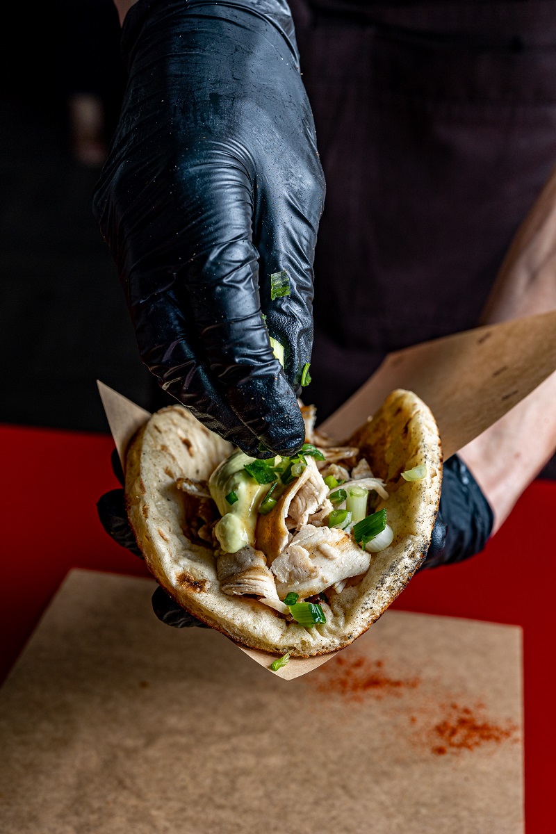 Τα πάντα εδώ φτιάχνονται στο χέρι. Το κρέας το αγοράζει από την Κεντρική Κρεαταγορά του Ρέντη. Τον γύρο, όπως και τα καλαμάκια, χοιρινά και κοτόπουλο, τα ετοιμάζει εκείνος. «Όλα βγαίνουν από αυτή την κουζίνα που βλέπεις», μου λέει και μου δείχνει μια κουζίνα που λάμπει. Ο γύρος είναι το μεγάλο του σουξέ. Του βάζει μόνο μαύρο τριμμένο πιπέρι, ρίγανη και ένα μιξ δικών του μπαχαρικών. Τελειώνει νωρίς το απόγευμα, κι ας είναι 45 κιλά κρέας! Και όταν τελειώνει, δεν βάζει άλλον μπροστά. Τον κόβει τη στιγμή που του τον ζητάνε. «Το κρέας δεν πρέπει να περιμένει», μου λέει ενώ μου δίνει ένα τυλιχτό να δοκιμάσω.