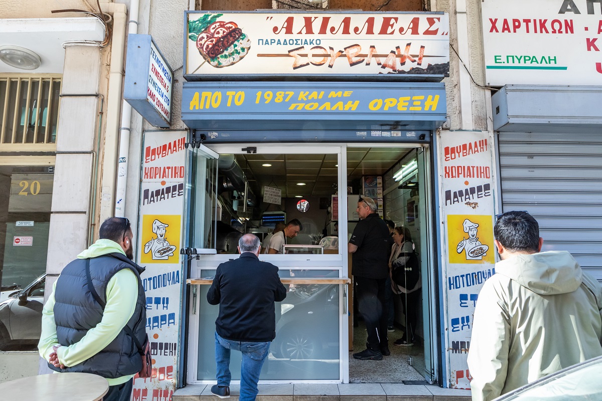 Τις δύο προηγούμενες φορές που είχα επιχειρήσει να επισκεφτώ τον Αχιλλέα στον Νέο Κόσμο κατέληξα να φεύγω χωρίς να δοκιμάσω τίποτα. Τη μία είχε τελειώσει τόσο ο γύρος τους όσο και τα καλαμάκια και τη δεύτερη έπρεπε να περιμένω τουλάχιστον μισή ώρα – που δεν είχα στη διάθεσή μου. Βέβαια, τα είχα δοκιμάσει σε ένα φιλικό σπίτι και ήξερα για τι σουβλάκι μιλάμε. Αυτή τη φορά κανόνισα να πάω με το που ανοίγει. «Έλα κατά τις 16.30 για να είσαι σίγουρος», μου είχε πει στο τηλέφωνο γελώντας ο Μαρίνος Μαρτόπουλος, ο τωρινός ψήστης και ιδιοκτήτης. Με τον Αχιλλέα γνωρίστηκαν το 1994 σε ένα κρεοπωλείο της γειτονιάς όπου εργαζόταν ο Μαρίνος. «Τότε έψαχνε ψήστη. Ταιριάξαμε και κάπως έτσι ξεκίνησα να δουλεύω εδώ». Με τα χρόνια το μαγαζί πέρασε στα χέρια του. Δεν άλλαξε τίποτα – ούτε και το ορθογραφικό λάθος σε μια χειρόγραφη πινακίδα. Έμεινε πιστός στην ίδια φιλοσοφία.
