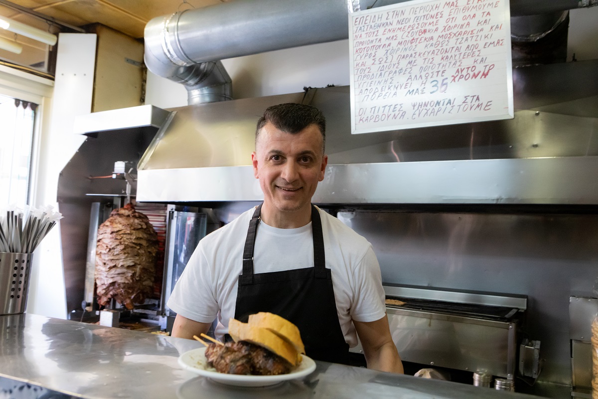 Στο σουβλάκι του δεν βάζει πολλά πράγματα: γιαούρτι (όχι τζατζίκι), ντομάτα, μαϊντανό, κρεμμύδι και κόκκινο πιπέρι. «Αν κάποιος το θέλει και πιο καυτερό προσθέτω μπούκοβο». Την ώρα που μου το λέει, ένας τουρίστας έχει μπει μέσα για να βγάλει μια φωτογραφία. Ο Κώστας χαμογελά και τον ευχαριστεί. «Γίνεται συνέχεια αυτό. Και αν έρθουν μία μέρα, επιστρέφουν και τις επόμενες». Και πώς να μην επιστρέψεις γι’ αυτό το σουβλάκι; Μπορεί να είναι μικρό -σίγουρα θέλεις δύο για να χορτάσεις-, αλλά είναι τόσο νόστιμο και τόσο απλό!
