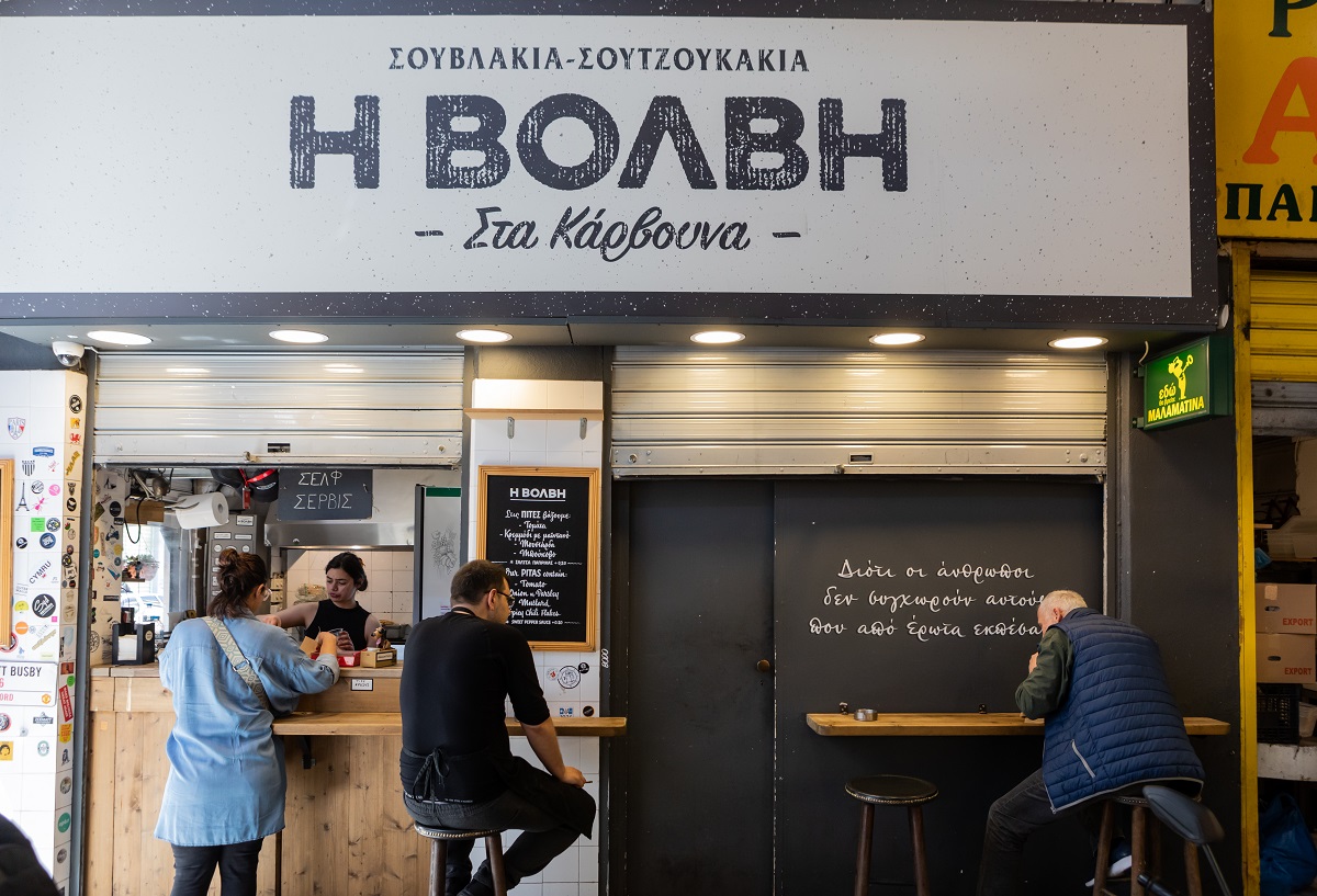 Βρίσκεται στην πλαϊνή είσοδο της Βαρβακείου, στην οδό Ευριπίδου. Μαγαζί γωνία, που λέμε. Μικρούτσικο, χωράει ίσα-ίσα μία ψησταριά, ένα ψυγείο, τον ψήστη και τον τυλιχτή. Αυτή είναι η Βόλβη, ένα σουβλατζίδικο που άνοιξε την περίοδο της δεύτερης καραντίνας. Δημιούργημα του Άρη Δούκα και του Τάσου Περδίκη. Με τον τελευταίο είχα δώσει ραντεβού μια Παρασκευή μεσημέρι για να πούμε δυο κουβέντες και να τραβήξουμε και φωτογραφίες. Τον πέτυχα την ώρα που ζύμωνε τα σουτζούκια, δίπλα στην εξίσου μικρή αποθήκη. «Άργησες και έπιασα να πλάθω. Τώρα θα περιμένεις να τελειώσω και μετά θα βγάλουμε φωτογραφίες», μου είπε με το σύνηθες ψαρωτικό του ύφος.