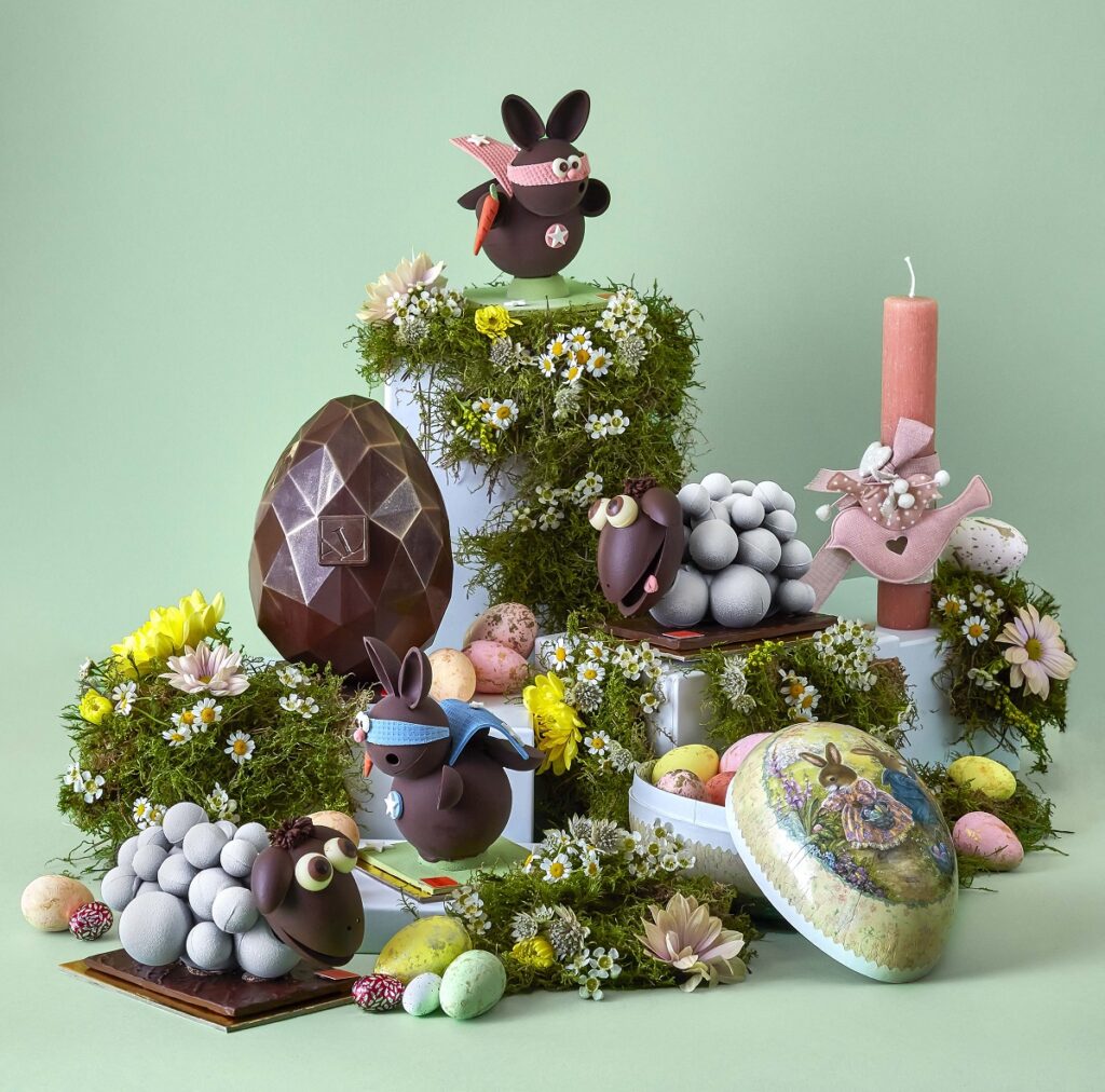 Τα γλυκά του Δημήτρη Οικονομίδη είναι σκέτα αριστουργήματα και πολύ νόστιμα. Στην ίδια λογική, αλλά με μια πιο κυβιστική ματιά είναι και τα φετινά σοκολατένια του αυγά. Εντυπωσιακά, όμορφα, γοητευτικά και φυσικά πολύ νόστιμα. Το πρώτο είναι φτιαγμένο από σοκολάτα γάλακτος Valrhona 46% (έρχεται από την Δομινικανή Δημοκρατία) με μια λεπτομέρεια από σοκολάτα με σμέουρα και έχει την μορφή προσώπου, ενώ για το δεύτερο χρησιμοποιεί bitter σοκολάτα μπίτερ 75% Nicolas Berger, και είναι γεμιστό με πραλίνα. Εξίσου εντυπωσιακά είναι και οι συσκευασίες τους που δεν θα σας κάνει καρδία να της χαλάσετε. Λεωφ. Κηφισίας 340, Νέο Ψυχικό, τηλ. 2106755000