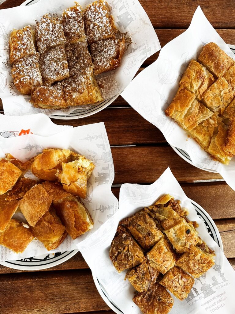 Στον κατάλογο του μαγαζιού φιγουράρουν καθημερινά μπουγάτσες με κρέμα, τυρί, κιμά, και σπανάκι ενώ τις Κυριακές την εμφάνισή τους κάνουν και αρκετά άλλα είδη, όπως αυτή με τη σοκολάτα κουβερτούρα και το ταχίνι ολικής άλεσης, η μπουγάτσα με κατσικίσιο τυρί, με πιο αλμυρή και ελαφρώς πιο έντονη γεύση από την καθημερινή μπουγάτσα με τυρί, η γέμιση της οποίας αποτελείται από μείγμα φέτας, μυζήθρας και γάλατος, καθώς και η, προσωπική μας αγαπημένη, σκέτη μπουγάτσα, που αφήνει τη μεγαλειώδη νοστιμιά του τραγανού φύλλου να πρωταγωνιστήσει. Με τη χρήση λεπτού φύλλου και το τύλιγμα της γέμισης μέσα σε αυτό αρκετές φορές πριν μπει στο ταψί, η κάθε μπουγάτσα φαίνεται να έχει 18-24 φύλλα.